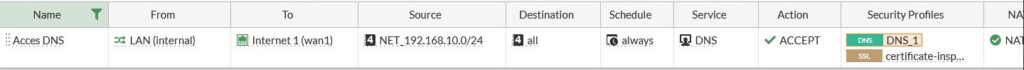 Dans « Service » il faut indiquer le protocole « DNS » et autoriser le trafic avec « ACCEPT« .