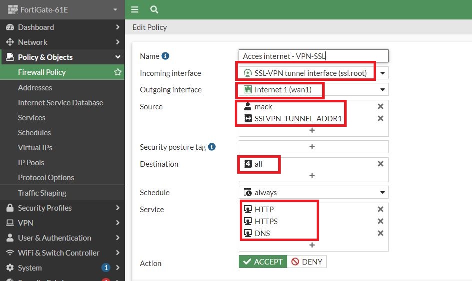 - Service: 443 (le port choisi dans la section « VPN-SSL Setting »)